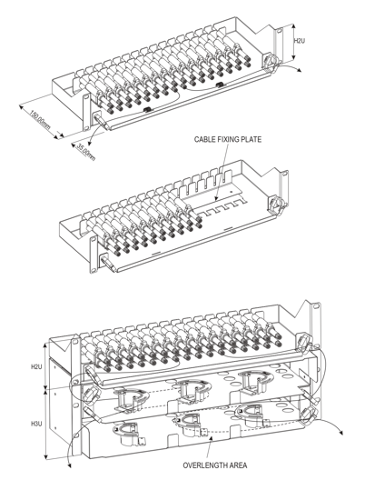 The 32 BKO 19″ 2U anchoring chassis can be used to anchor 32 micro breakout cables of diameter 5mm.