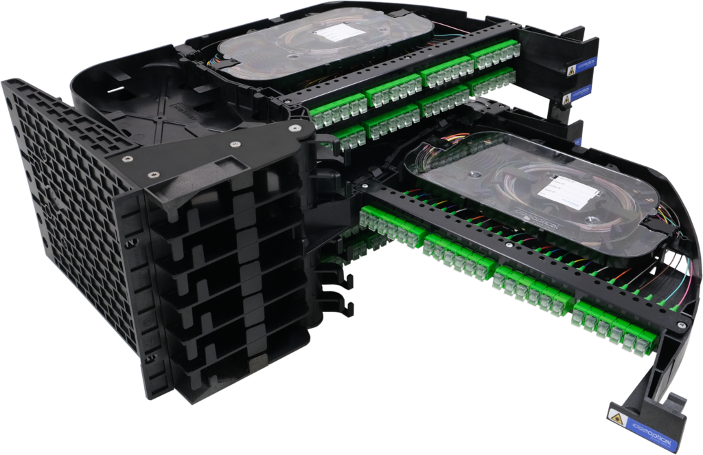 iTERA is a 19” pivoting optical rack designed to connect optical fibre by splicing. It includes up to 144 SC type connection points over a 4U height and provides direct access to the adapters.