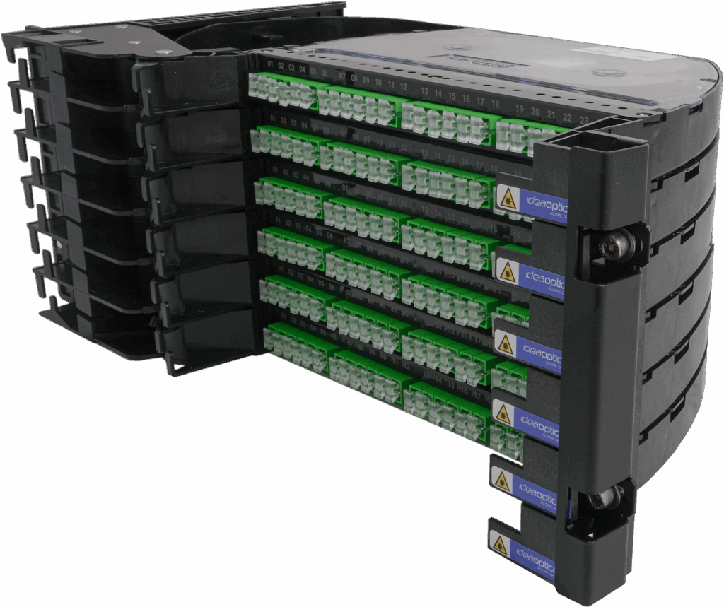 - 6 plateaux individuels pivotant à gauche de capacité 24 fibres en connectique SC/APC et détachables pour faciliter l’intervention ;
